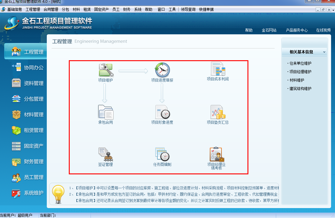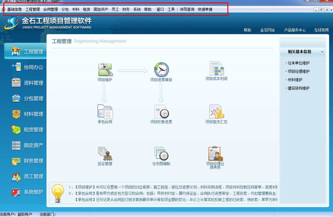 软件对工程的预算管理、计划进度、文档管理、合同管理(购销、承包及分包)、材料管理、劳务管理、自有设备管理(自有设备使用可实现自动计算租赁费)、租赁管理、材料供应商、员工考勤、工资管理、财务管理、车费管理、库存管理、施工日志、签证管理、事务管理等进行全方位管理。