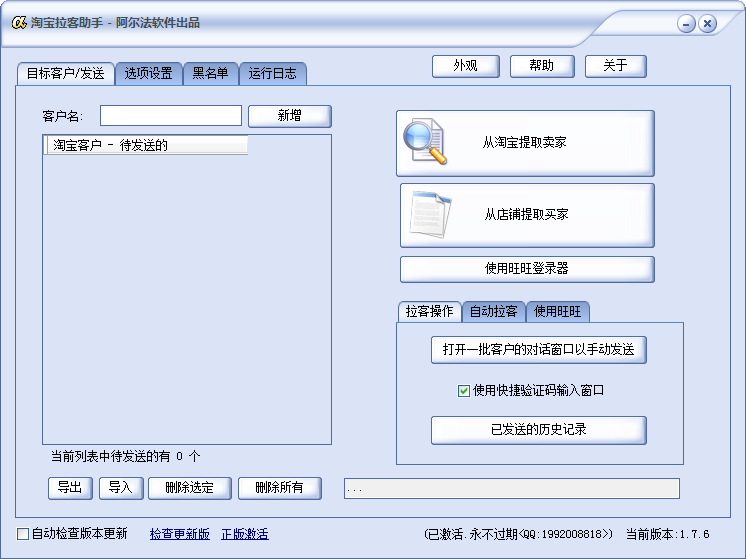 阿尔法淘宝拉客助手是一款淘宝营销软件,它可以从淘宝集市店铺的评价中采集买家旺旺ID(匿名的买家采集不到),或从淘宝采集卖家旺旺ID;然后有针对性的发旺旺消息,从而达无成本的营销效果。需要的网友可以来东坡网下载哦!