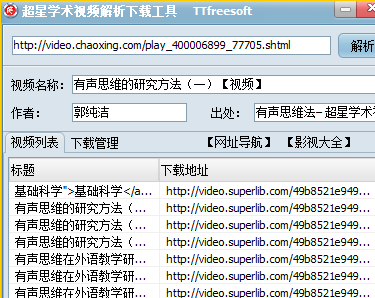 载解压后,双击 超星学术视频解析下载工具.exe 打开工具,把超星学术视频的播放地址,复制到工具中,点击“解析”按钮,即可得到视频的真实下载地址,在地址列表上,点右键,可以进行下载,或复制下载地址操作