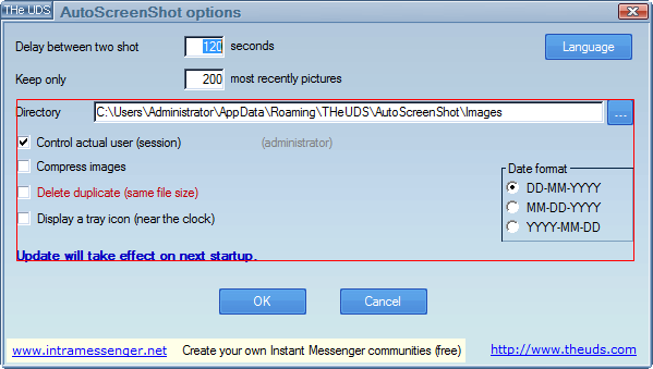 后台自动保存屏幕截图的软件AutoScreenShot 可以在后台自动将电脑画面截图保存起来,特别是将它加入开机启动并隐藏工具栏图标后,使用电脑的用户一般是不会察觉有它的存在的。因此,AutoScreenShot 可以用作监控电脑使用的目的,其作用可以适用于很多场景。
