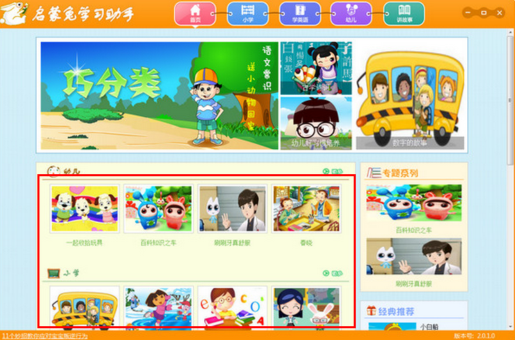 其实现在很多家人都知道小孩子越早学习,将来对读书上学都很有好处,这时就可以来此选择启蒙兔学习助手,它是专门针对学前儿童开发出来的软件,里面包括了常见的幼儿英语与十万个为什么等等十分丰富的学习资料,而且这个软件小孩子操作起来也是相当的适合!