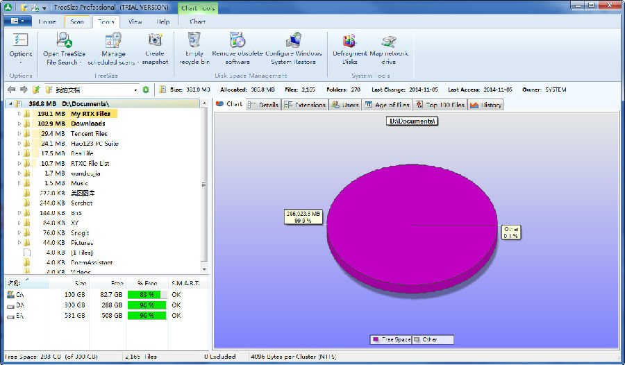 TreeSize硬盘空间回收器, 它能够显示文件大小和实际占空间数及其浪费的空间等, 让你做出相应的删除决定。