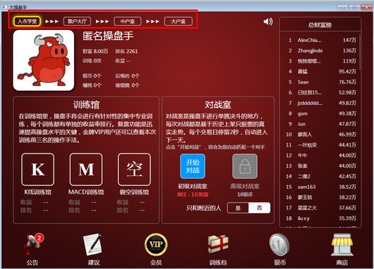 大操盘手是款最新的股票软件工具,它最大的特点就是有做空训练馆给大家进行练习外,还有和高手之间对决机会,增加自己的操盘手法!