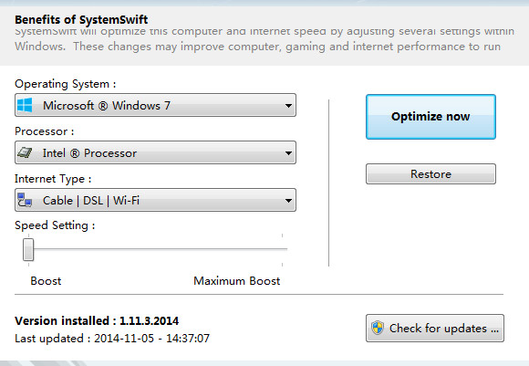 SystemSwift(系统加速)是款三合一软件,能够提升电脑运行速度+游戏运行速度+网速,是款功能强大的多功能软件。
