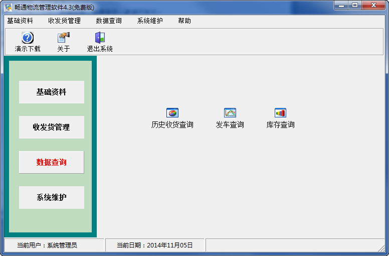 数据查询:历史收货查询、发车查询、发车结算管理、库存查询。