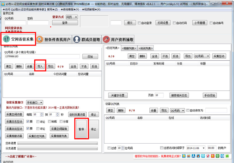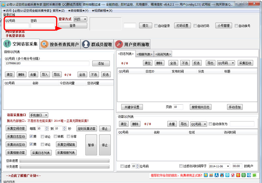 1.QQ空间访客采集:(QQ空间日志互动、QQ空间说说互动、QQ空间相册访客、QQ空间留言等)。【如果采集的空间较多,需要多个小号采集】