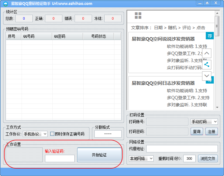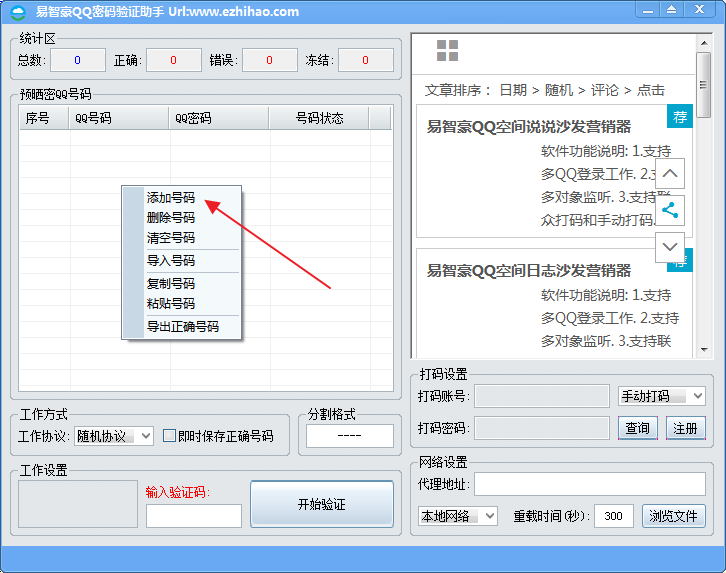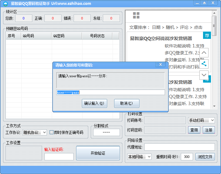 有很多玩营销的用户,都是从各种渠道购买来的小Q(QQ小号),但是有时候购买100个,会有一些密码不正确的,易智豪QQ密码验证助手就能解决这个问题。
