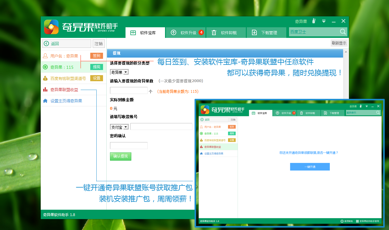 大家可能会注意到一个细节,就是软件助手里面开设的奇异果联盟和百度有钱联盟专栏,顾名思义,这正是为每个装机人员设计的亮点!只需注册登录奇异果 - 个人中心设置渠道号 - 开始安装软件获得收益!