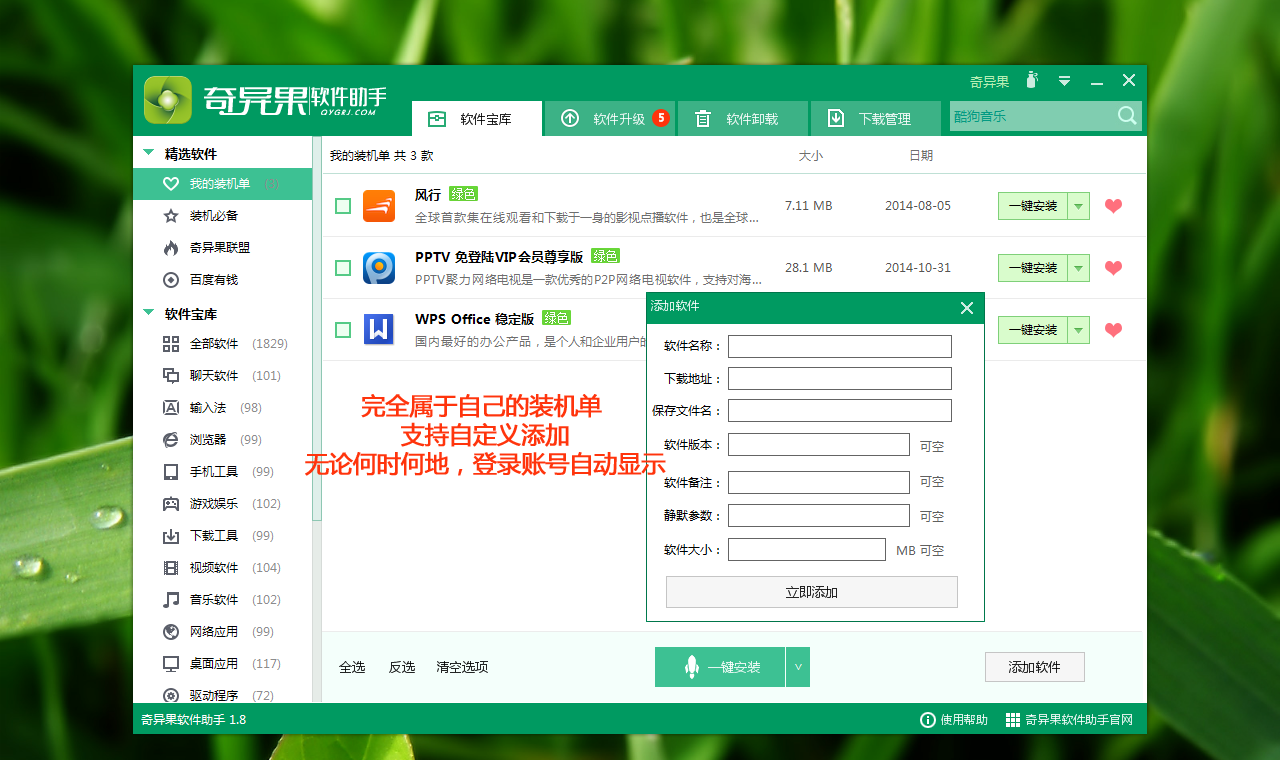 获取最大收益!奇异果软件助手不仅开设【奇异果联盟】、【百度有钱联盟】专栏,而且支持在【我的装机单】添加自定义软件(可以是第3方联盟提供的)!