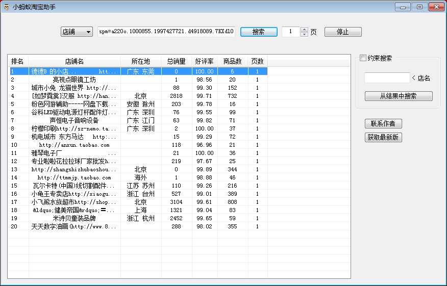 小蚂蚁淘宝助手(淘宝宝贝查询工具)是一款绿色免费的可以在电脑端批量搜索宝贝和店铺信息的软件。软件功能强大,它可以批量搜索多页的宝贝信息,并对宝贝的信息进行提取,显示宝贝的排名、价格、所属店铺等信息,通过这些信息可以对店铺的排名进行查询,批量显示,欢迎下载试用。