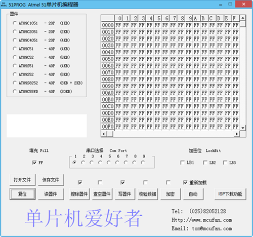 51PROG Atmel是一个绿色免费的51单片机编程软件,可以烧录Atmel公司系列单片机芯片,既可以在编程器上采用并行算法对单片机编成,又可以通过ISP电缆对用户电路板上的单片机进行在线编程。本编程器还具有性能稳定,烧录速度快,性价比高使用方便(USB接口,一根电缆搞定供电和通讯,无需额外电源)等优点。