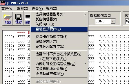 方法一:直接执行"设置"菜单下的"自动查找硬件",软件会自动扫描硬件连接在哪一个端口,并检测编程器的型号,扫描完成后软件会自动切换到正确的连接端口与编程器型号,并提示找到编程器,如果软件在扫描完成后扔提示找不到编程器则有可能:编程器硬件连接不良或电源没有打开.