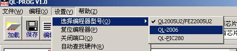 方法二:直接通过软件右上方的"选择通信端口"下拉列表选择当前硬件连接的串口(注意:当前列表中只显示当前电脑中存在的串口,如果你的电脑串口只有COM1,则此列表中也只会有COM1可供选择),直接通过“设置”菜单下的“选择编程器型号”来选择正确的编程器.