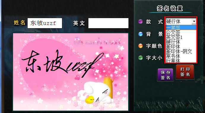 不是所有人的名字都可以设计成一笔签名的,部分字可能比较复杂,无法使用一笔签,所以本软件还提供了其他款式使用,有公文签、英文签、硬行体、篆印体、草书体、行草体。