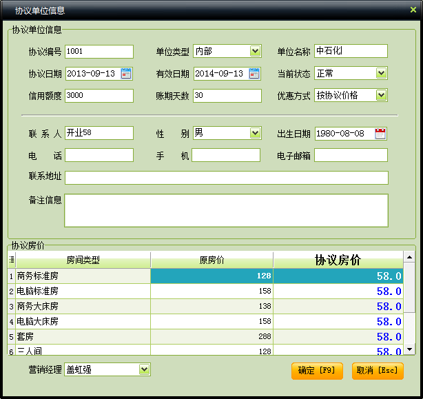 1、用来管理协议单位的基本信息和房价信息,可对协议单位按类型分类,对不同的单位可设不同的房价和打折比例。满足酒店对协议房价和协议单位信息的日常管理