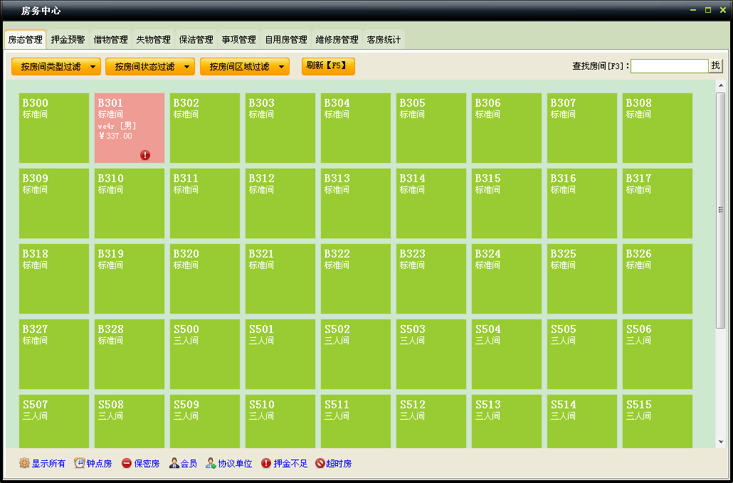 房务中心是酒店不可缺少的部门,此模块用来查看更改房间状态,押金预警、借物管理、失物管理、保洁管理、事项管理、自用房管理、维修房管理、客房统计等功能。