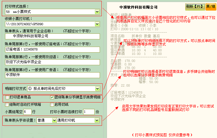1.账单打印设置:支持小票打印模式和票据打印模式两种,支持客户对小票显示内容的自设计功能;