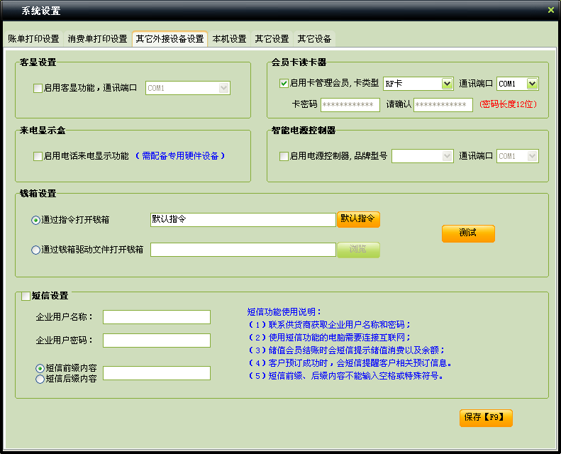 (2)会员卡读卡器:如果是接触式IC卡或感应式M1卡需要在此设置启用,其它磁