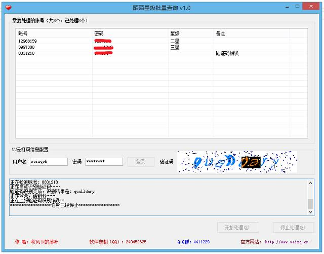 2、打开软件,首先输入UU云打码平台账号密码并点击登录,确认账号密码正确后,点击【开始处理】按钮,软件将自动查询陌陌账号的星级,并将结果实时显示在列表上