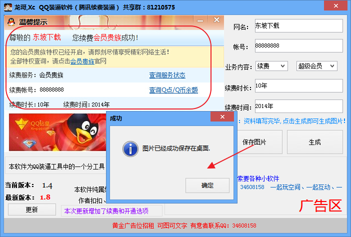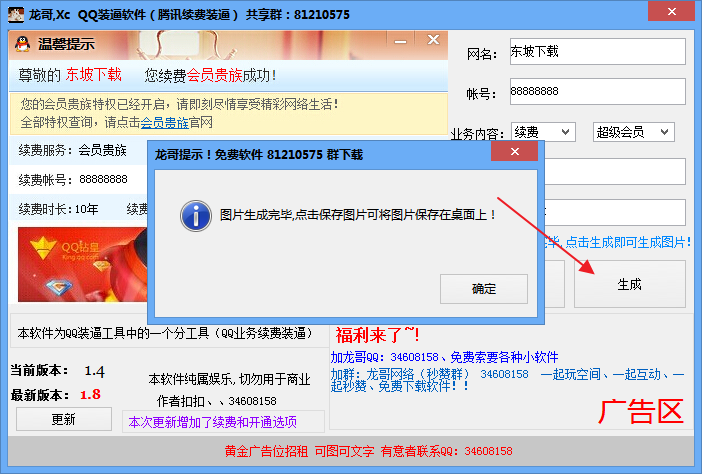 龙哥QQ装逼软件(腾讯续费图片生成器)是一款绿色免费的由小龙软件下载官网推出的模仿腾讯开通续费QQ业务的软件生成器。软件功能强大,操作简单,超逼真,软件娱乐,禁止用于非法用途。