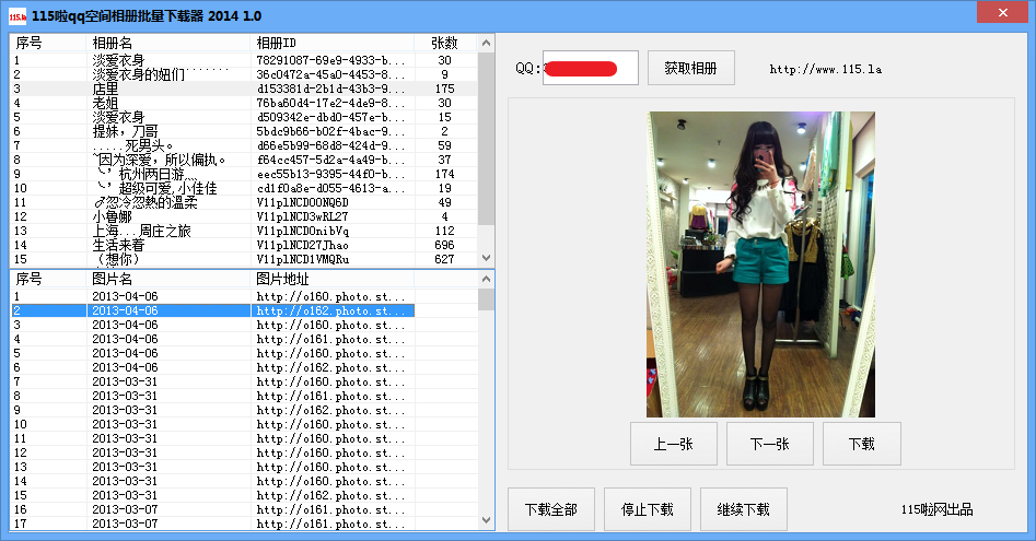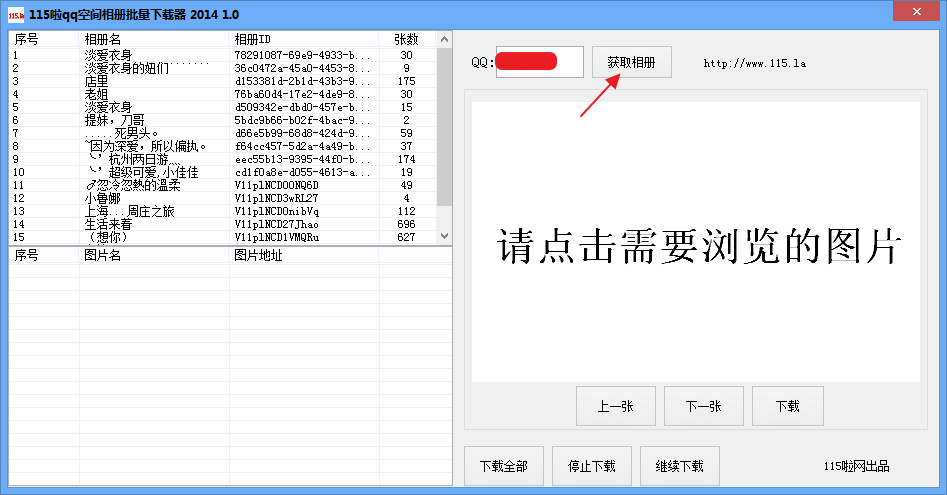 115啦QQ空间相册批量下载器(QQ相册批量下载器)是一款绿色免费的由115啦网官方制作的QQ空间相册照片批量下载工具。软件功能强大,可以帮助您将自己QQ空间的多个乃至无数张相册照片或者好友的QQ空间相册照片批量下载下来。