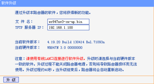 2、升级过程中不能关闭路由器电源,否则可能导致路由器损坏。