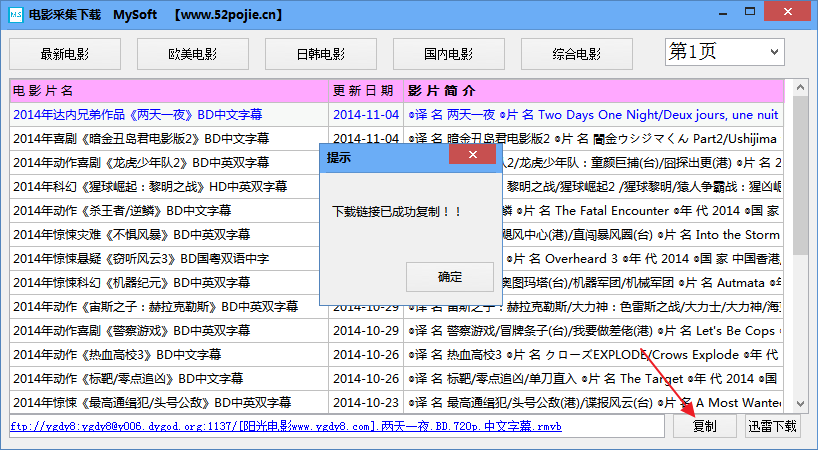 2、双击电影名,点击【复制】即可将电影下载链接复制下来,再使用迅雷等下载工具即可进行该电影下载
