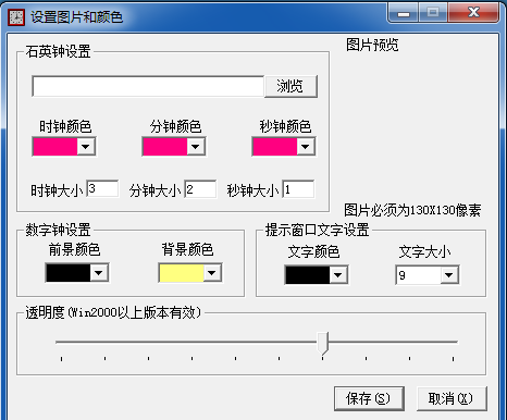三、石英钟的背景图片必须为130X130像素,您可以制作好图片后,再到本程序中通过缩放满足要求。在测试中发现当图片中的圆形外框为深色时(比如软件内置的前三款为红色)去杂色效果好,而为浅色时有可能出现边出现“杂刺”。