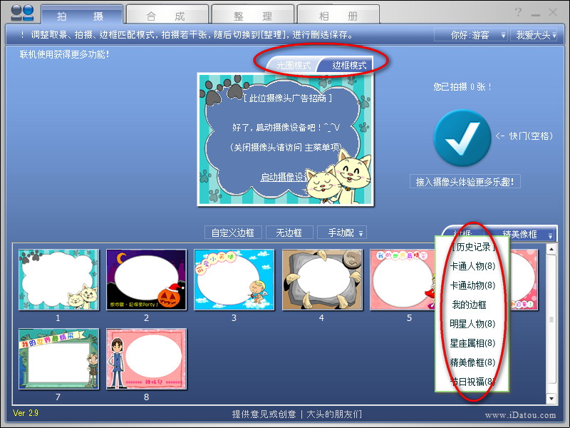 2、安装完成后,可以调整取景、拍摄、边框匹配模式等,电脑必须安装有摄像头。