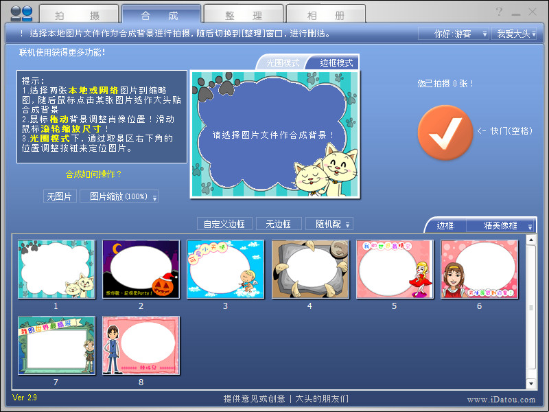 《我爱大头》是一款大头贴制作的娱乐软件,它可以帮助您通过摄像头拍摄或已有相片来合成大头照,以前想拍大头照只好去大街上,现在只要坐到电脑前面就可以制作丰富绚丽的大头照了,制作中还可对图像进行效果调节。