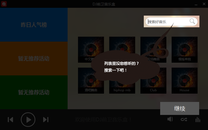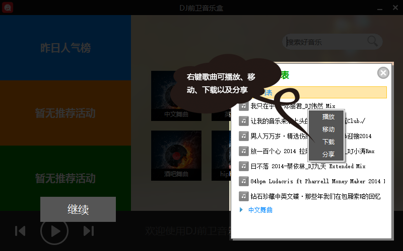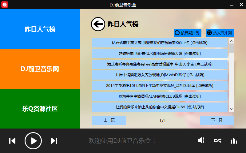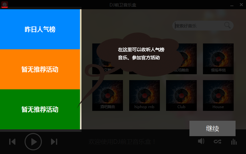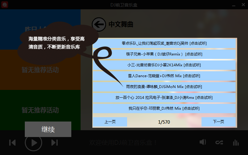 DJ前卫音乐盒是一款高音质的在线播放音乐盒。具有“DJ超多”、“音质超高”、“完全免费”三大特点。五万多首DJ舞曲无需下载,一点即播。中国第一款320kbps高音质mp3格式DJ舞曲在线播放的音乐盒。320kbps高音质mp3格式dj在线播放的播放器。 用户也可下载、分享音乐。