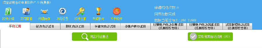 一马淘宝免费试用申请助手是一款非常好用的将淘宝试用申请操作由繁变简的软件。软件功能强大,无需复制粘帖即可完成淘宝试用申请的自动提交,是淘宝试用者必备的屡试不爽的软件。另外本软件将会持续添加其他功能,比如天猫抢猫猫活动等等一系列比较让大家觉得无聊或者繁琐的操作。