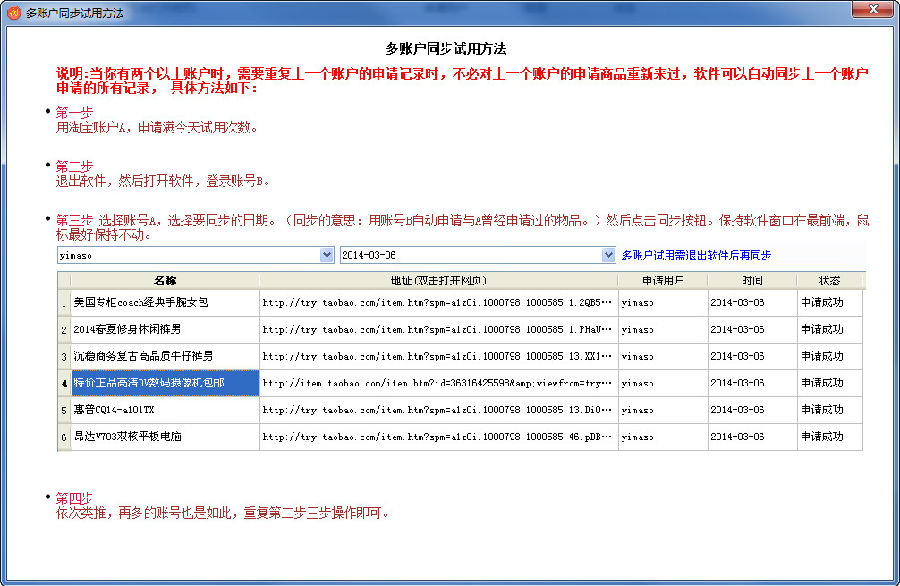 说明:当你有两个以上账户时,需要重复上一个账户的申请记录时,不必对上一个账户的申请商品重新来过,淘宝试用软件可以自动同步上一个账户申请的所有记录, 具体方法如下: