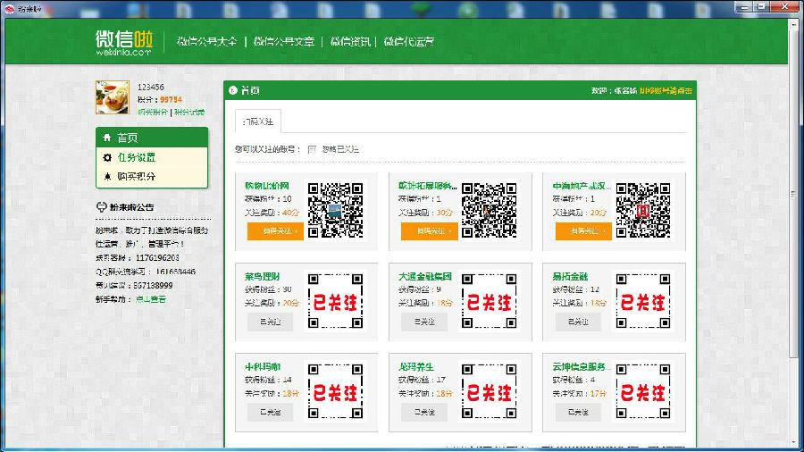 用户使用粉来啦,通过关注别人的账号或购买来获得积分,然后利用自己得到的积分为自己的微信账号求粉,从而达到互粉的效果。