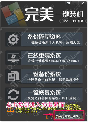1.运行完美一键装机软件,然后点击安装与卸载超级模块按钮如下图所示: