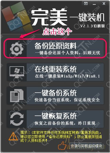 1、首先运行完美一键装机软件,然后点击备份还原资料如下图所示: