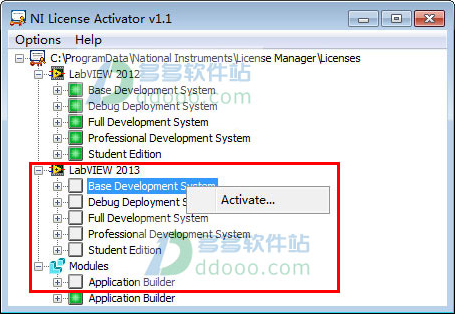 2、注册机中展开LabVIEW2013菜单,每一个选项都右击选择“Activate...”激活软件。