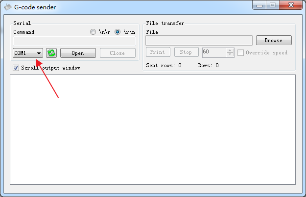在下拉框里选择你的arduino端口,然后点击“open”打开端口,让软件能和arduino通讯。