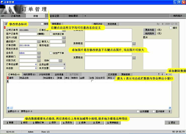 1、业务单位是客户管理模块的主程序,你可能需要先定义贵公司的单位大类(点击业务单位详细里的大类选择按钮),新建单位时名称是必输,大类也不要空着,小类可以自由输入,或可以从历史数据里选择。大类是客户时可以在业务信息页面里定义业务属性,属性第一项输入的数据自动反映到子页面的标签名称上,比如某个客户您卖给多种产品,则每种产品可以建一个业务信息子页面,属性第一项就输入产品名称。你还可以自定义两个表格。业务单位权限设置可以指定用户的权限,比如某个用户的单位大类权限是’客户,供应商’,则他能看到所有客户和供应商,但看不到其它大类的单位。
