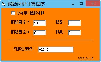 钢筋面积计算程序是一款能够快速计算出钢筋面积的简易软件,这款软件不只是能够计算钢筋的面积,还能够计算分布筋的面积。这款软件使用简单,打开软件后输入数据即可自动得出结果。