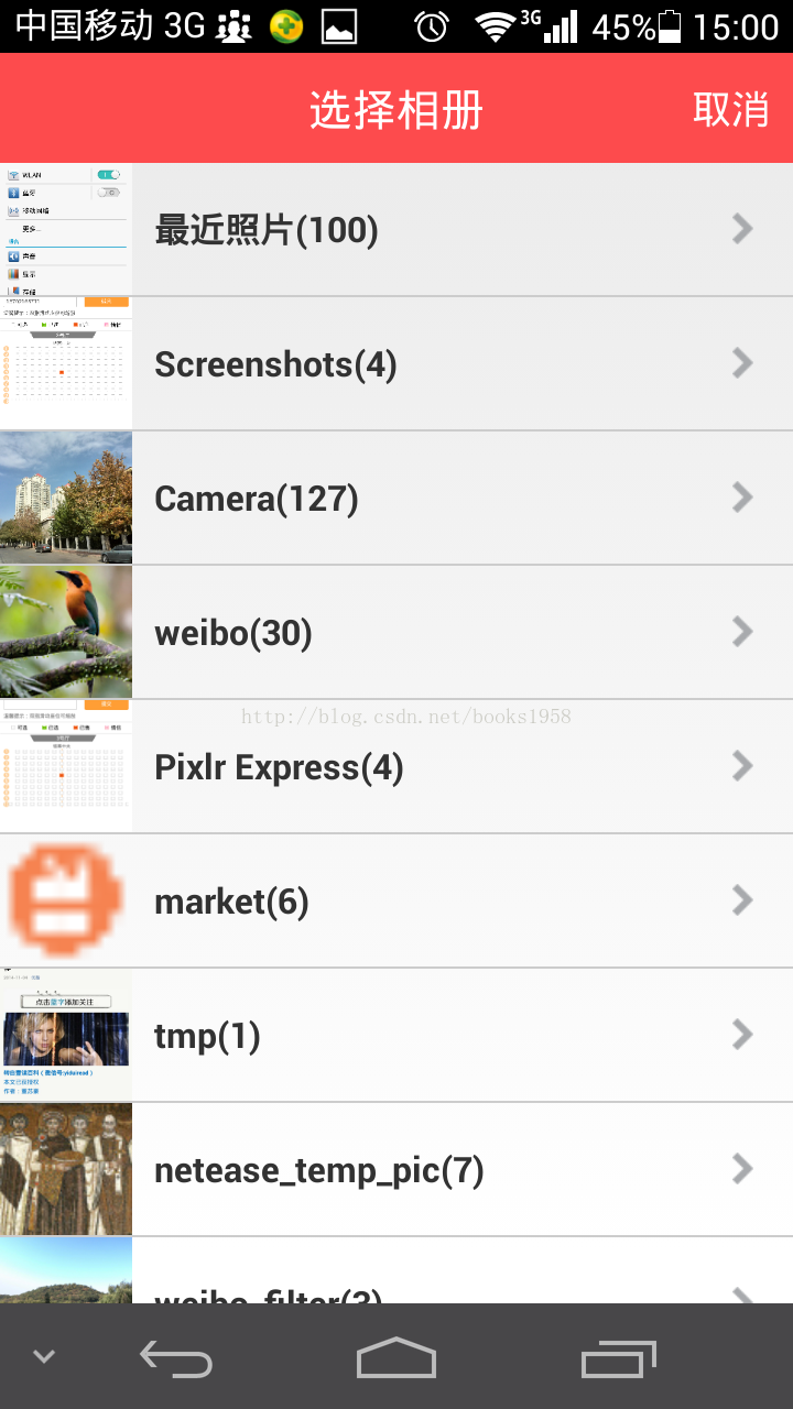 3.选择照片页面 与 选择相册页面 相互切换并且不走onCreate(切换十分流畅),同时设置页面切换动画以提升用户体验。