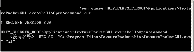 我们会发现,返回的结果中,前4行是无用的信息。然后以“REG_SZ ”作为分隔符进行字符串分隔。得到包含空格的路径信息:"G:\Program Files\TexturePacker\bin\TexturePackerGUI.exe" "%1"