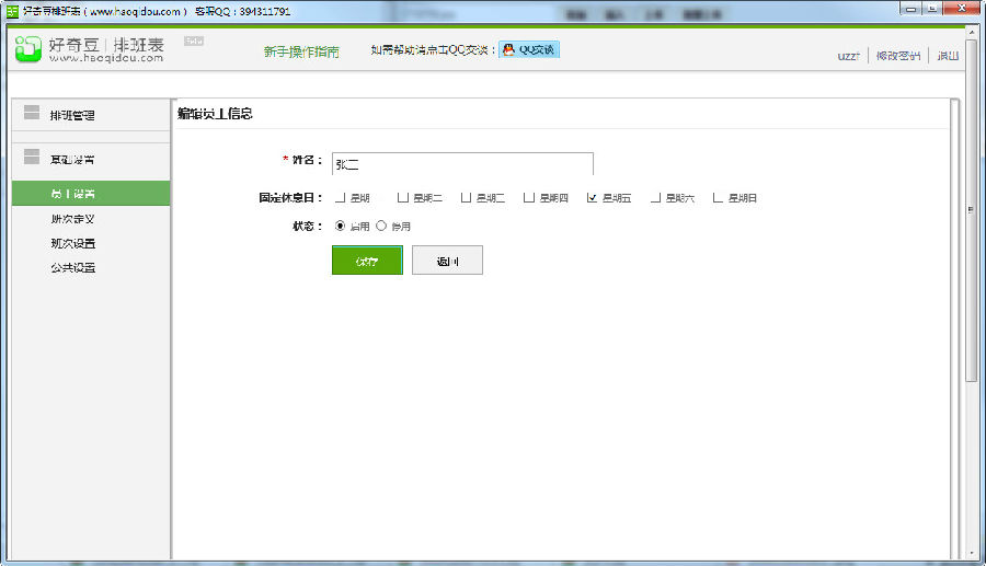 (1.2)点击按钮“添加员工”,录入员工姓名、勾选固定休息日,点击保存按钮。