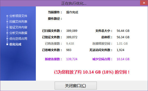 扫描结束后。你看这是扫描结果。。。已有连接数是9438,这是已经被处理为硬连接的文件,释放了将近1GB的空间,这是我之前编写软件时测试生成的……额。。这个数字不太好。。