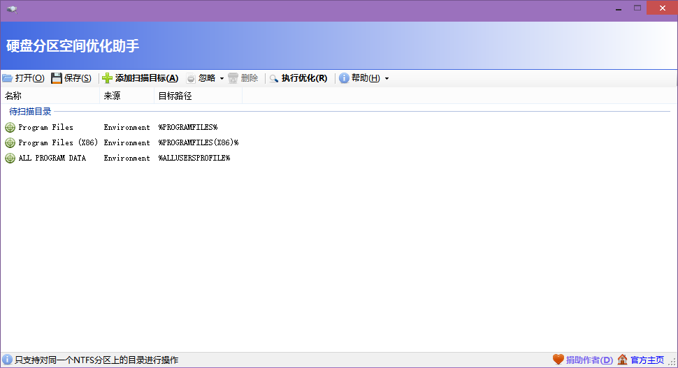 点击“打开”,浏览到软件目录下自带的“1.扫描应用程序目录.apj”项目,并打开,可看到如下三个路径。这里对应了Program Files目录以及ProgramData目录。