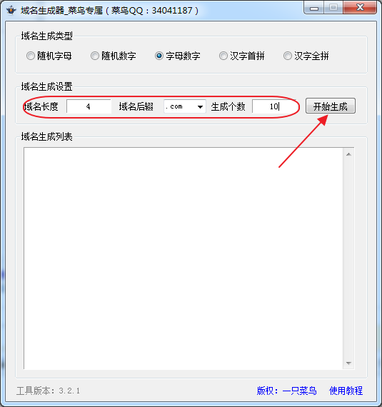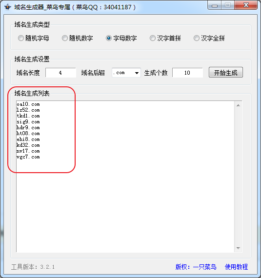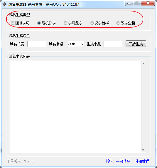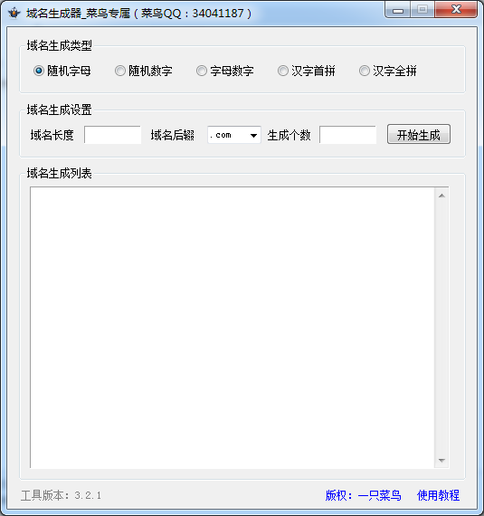 菜鸟随机域名生成器是易语言所开发的一个小助手工具,提供多种方式的生成类型,可根据您的实际情况进行生成操作。