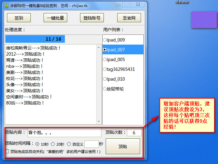 3、顶贴最好设置时间间隔,一些“新号”快速操作百度系统会自动将你的回帖屏蔽掉,“老号”可以视情况而定。