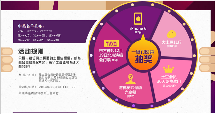 活动规则:只要一件订阅本页面的土豆自频道,就有机会赢取肾6大奖,每个土豆帐号有3次机会哦!