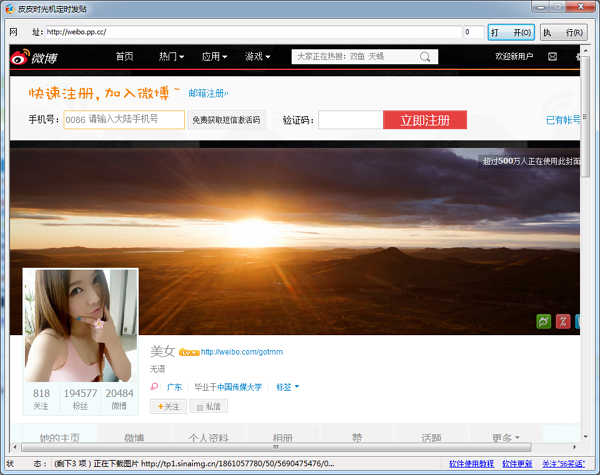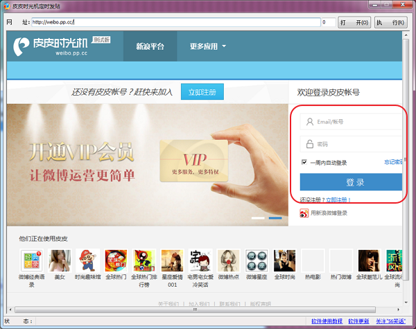 此工具是一款基于浏览器制作的小工具,使用微博定时发送时需要注册皮皮时光机账号