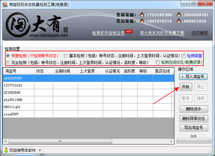 淘大有淘宝旺旺状态批量检测工具是一款绿色好用的由淘大有软件官方推出的批量检测淘宝旺旺号是否异常、被封、注册时间、最后登录时间、认证情况、活跃度、等级、信用的软件,无需密码,免登录批量查询淘宝旺旺状态!可以自由排序、删除选中、一键删除异常状态的帐号、导出等!
